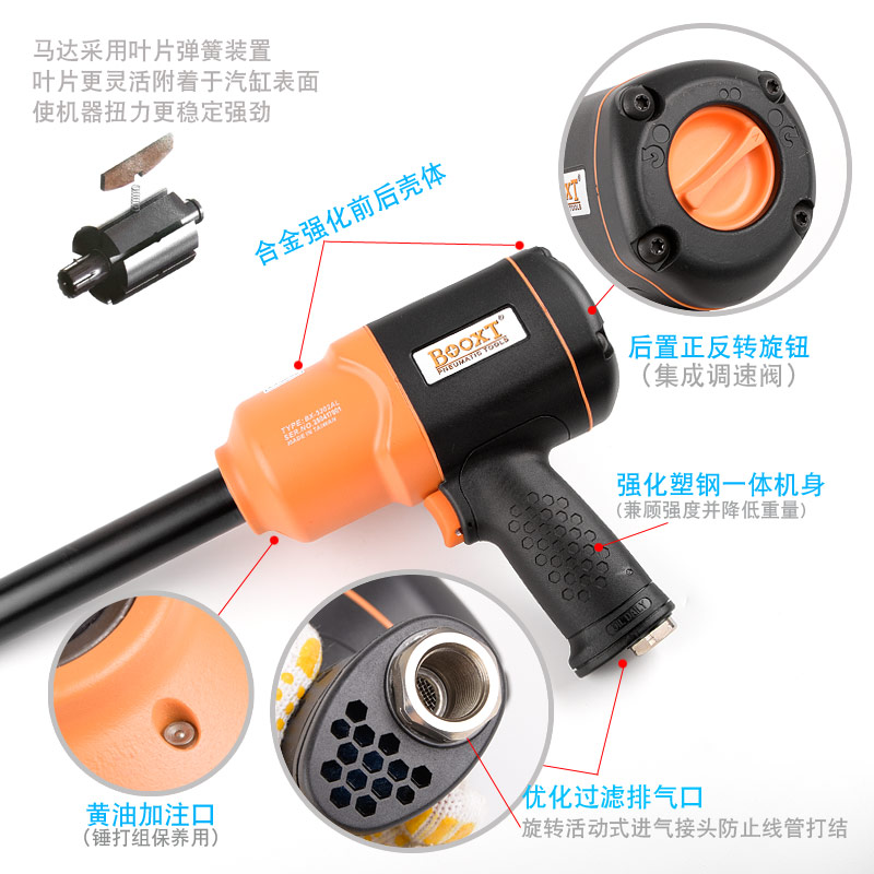 加長軸風動扳手特點:(塑鋼外殼,強度高重量輕,扭力大)